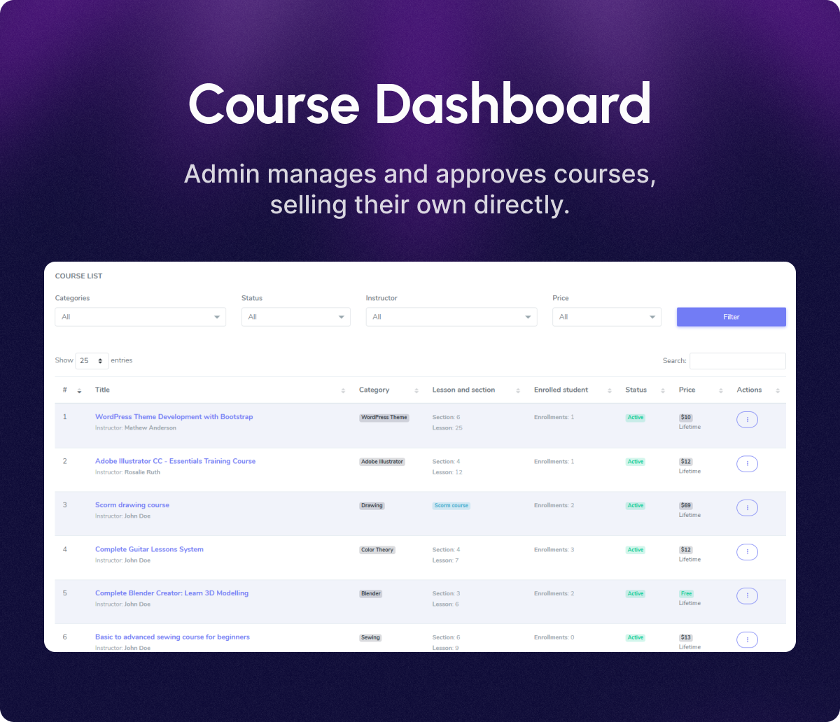 The instructor or course creator has to create lessons, quizzes, and add attachments under the course. Later, the course creator can update, modify, or remove the course. On the other side, students have to purchase the course to enroll in a course. In this learning platform, the course is a medium to connect the users to work together. Multiple instructors can create a course here.