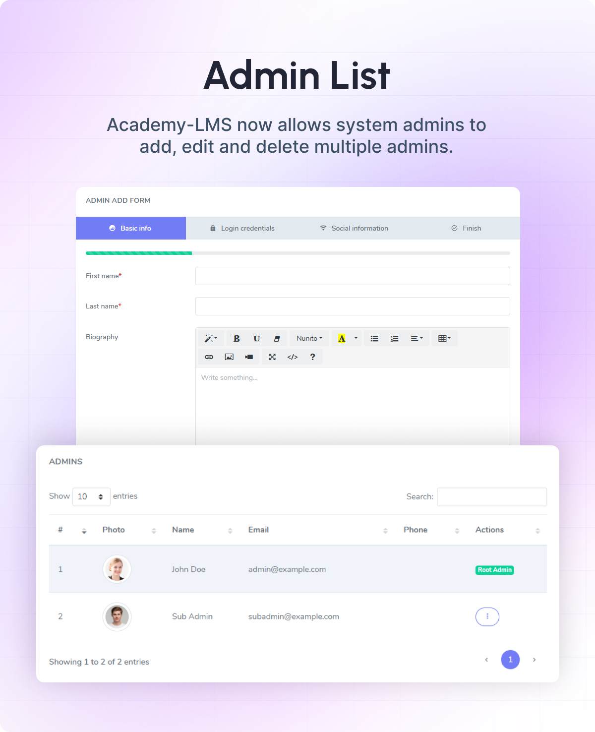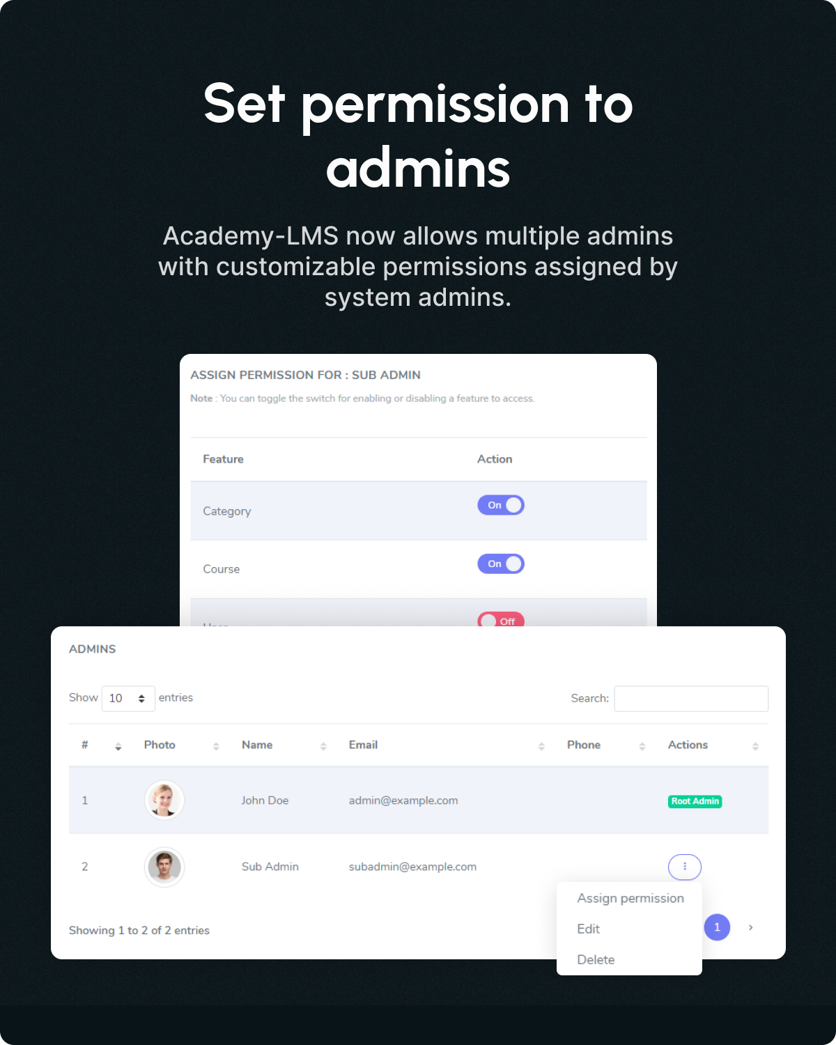 An admin is a user who has the highest number of privileges, permissions, and responsibilities in Academy LMS. The admin has to manage the entire system to operate the application.